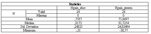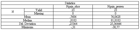 Based on the results of the descriptive statistical analysis, the mean gain score was 0.7587, which, when converted into a percentage (N-gain percent), amounts to 75.87%. The median gain score was 0.8173 or 81.73%, indicating that half of the students experienced a learning improvement above that value. The standard deviation of the gain score was 0.24825, while the standard deviation for the percentage gain was 24.82%, reflecting variation in the level of improvement among students. Meanwhile, the minimum gain score was found to be -0.31 or -30.77%, indicating that one or more students experienced a decline in their scores after the intervention.