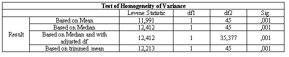 Based on the results of Levene’s Test, as presented in the Test of Homogeneity of Variance table, the significance value was 0.001 across all four approaches: based on the mean, the median, the median with adjusted degrees of freedom, and the trimmed mean. Since all significance values are less than the 0.05 threshold, this indicates that there is a significant difference in variances between the pre-test and post-test groups.