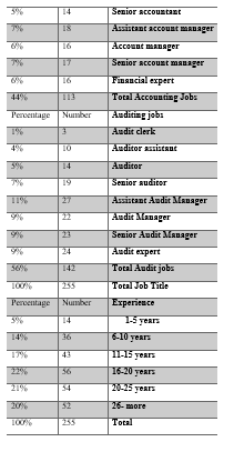 The job title indicates that the most prominent members of the sample have job titles that fall within the audit titles and by 56% and the remaining percentage of accounting jobs.