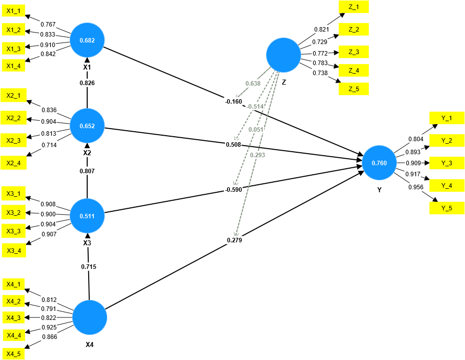 Analisis data dilakukan dengan memasukkan tabulasi data kuesioner dan menguji convergent validity, discriminant validity, dan uji signifikan. Model pengukuran reflektif dievaluasi dengan convergent dan discriminant validity dari indikatornya dan composite reliability.Berikut adalah tampilan hasil output SmartPLS: