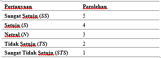 Skala pengukuran yang digunakan dalam teknik pengumpulan data adalah Skala Likert dengan lima poin, di mana responden memberikan tanggapan berdasarkan derajat persetujuan atau ketidaksetujuan terhadap pernyataan yang disajikan yaitu sebagai berikut: [52]