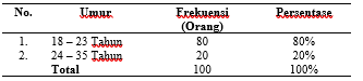 Tabel 3, dapat dilihat dari 100 responden sebanyak 80% atau 80 orang pada umur 18 – 23 tahun sedangkan 20% atau 20 orang pada umur 24 – 35 tahun. Bisa disimpulkan bahwa responden yang paling dominan ialah berumur 18 – 23 tahun.