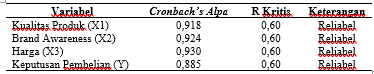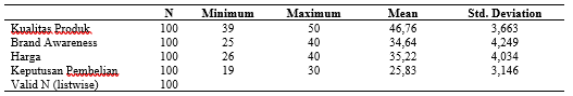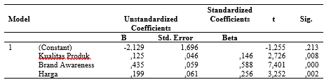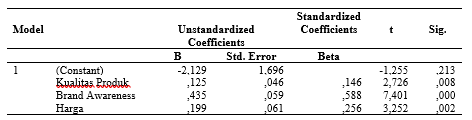 Nilai konstant sebanyak -2,129 dengan nilai negatif, ini dapat disimpulkan bahwa tanpa variabel Kualitas Produk (X1), Brand Awareness (X2), Harga (X3), Keputusan Pembelian (Y) akan mengalami penurunan sebesar 212,9%.