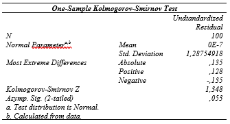 Pada uji parsial (uji t) dilakukan dengan tingkat kepercayaan 5% atau 0,05 dan menggunakan nilai df K=3 dan df2=n-k-1 (100-3-1=96). Bahwa hasil yang diperoleh nilai t tabel sebesar 1,984. Maka pengaruh variabel independen terhadap variabel dependen secara parsial adalah sebagai berikut :