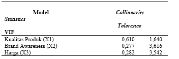 Dari Tabel 11, dapat disimpulkan bahwa nilai VIF (Variance Inflation Factor) untuk variabel kualitas produk (X1) adalah 1,640, yang lebih kecil dari 10, dan nilai tolerance adalah 0,610, yang lebih besar dari 0,1. Untuk variabel brand awareness (X2), nilai VIF adalah 3,616, yang juga lebih kecil dari 10, dan nilai tolerance adalah 0,277, yang lebih besar dari 0,1. Selanjutnya, untuk variabel harga (X3), nilai VIF adalah 3,542, yang masih lebih kecil dari 10, dan nilai tolerance adalah 0,282, yang lebih besar dari 0,1. Hasil ini menunjukkan bahwa tidak ada gejala multikolinieritas antara variabel-variabel dalam analisis, karena semua nilai VIF berada di bawah batasan umum yang ditetapkan yaitu 10, dan nilai tolerance semua variabel cukup besar, lebih besar dari 0,1. Jadi, tidak ada masalah multikolinieritas dalam model regresi yang digunakan.