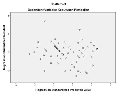 Dari gambar di atas, dapat disimpulkan bahwa tidak terdapat heteroskedastisitas dalam data, karena tidak terlihat pola yang jelas dari pola bergelombang atau penyebaran yang tidak merata dari titik-titik data di atas atau di bawah angka 0 pada sumbu Y. Oleh karena itu, dapat dianggap bahwa uji heteroskedastisitas telah terpenuhi, dan asumsi homoskedastisitas dapat dipertahankan dalam model regresi ini.