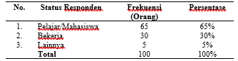 Berdasarkan tabel 4 dapat diketahui bahwa dari 100 responden sebanyak 65%, 65 orang pada pelajar/mahasiswa, 30% atau 30 orang pada pekerja, sedangkan 5% atau 5 orang pada lainnya. Bisa disimpulkan bahwa responden yang paling dominan ialah para pelajar/mahasiswa.