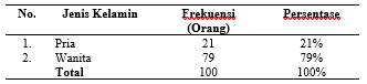 Berdasarkan tabel 2 dapat diketahui bahwa dari 100 responden sebanyak 21% atau 21 orang berjenis kelamin pria sedangkan 79% atau 79 orang berjenis kelamin wanita. Bisa disimpulkan bahwa responden yang paling dominan ialah berjenis kelamin wanita.