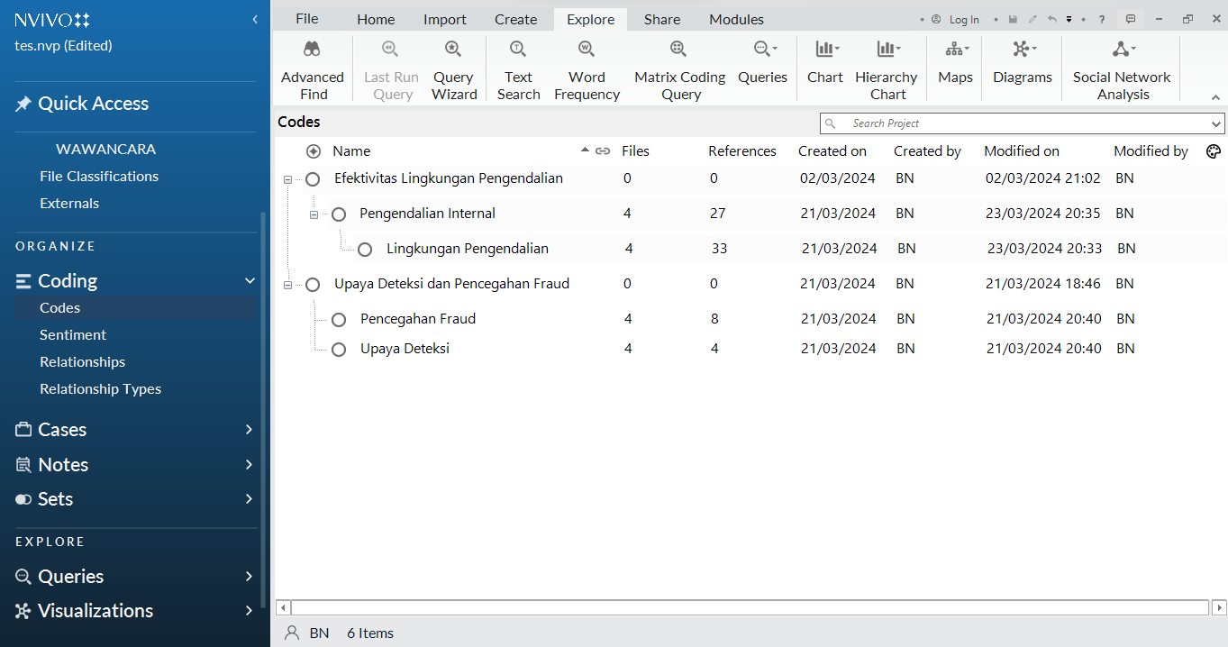 Setelah data terkumpul, penulis memasukkan data ke dalam software Nvivo untuk menganalisis data dari hasil wawancara mendalam dengan beberapa auditor. Dengan software Nvivo ini, transkip wawancara dapat terorganisir dengan baik. Selain itu, penulis melakukan coding yang bertujuan untuk menemukan tema-tema atau kata kunci yang akan dibahas dipenelitian. Software Nvivo menjadi alat yang sangat diperlukan penulis karena menghasilkan temuan-temuan akurat dan dapat diandalkan. Berdasarkan analisis data yang diperoleh dari software Nvivo, dibagi menjadi dua kode sebagai berikut: Pertama, efektivitas lingkungan pengendalian. Kedua, upaya deteksi dan pencegahan fraud. Dari kedua kode tersebut masing-masing kode dibagi menjadi dua yakni efektivitas lingkungan pengendalian meliputi pengendalin internal dan lingkungan pengendalian. Begitu juga upaya deteksi dan pencegahan fraud meliputi upaya deteksi dan pencegahan fraud. Berikut hasil coding dengan software Nvivo dan hasil projek map (coding dengan Nvivo) :