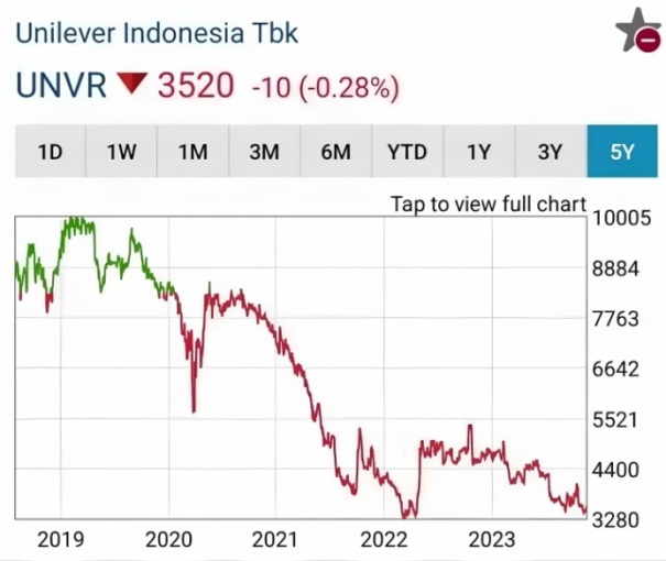 Pada gambar 1. menunjukkan grafik saham PT Unilever Indonesia Tbk. (UNVR) mengalami penurunan signifikan sebesar 64% dalam lima tahun terakhir, dipengaruhi oleh aksi boikot, dengan harga saham tercatat di angka 3.280 pada minggu kedua November 2023. Selain itu, PT Fast Food Indonesia Tbk. (FAST) juga terdampak, dengan penurunan saham sebesar 5,70% pada bulan yang sama . Penurunan harga saham berdampak pada PT Akasha Wira Internasional Tbk. (ADES), yang turun 7% dalam dua bulan terakhir, mencapai Rp8.725 per lembar pada 15 November 2023. PT Erajaya Swasembada Tbk. (ERAA) juga terpengaruh oleh boikot terhadap produk terkait Israel, termasuk iPhone. Selain itu, penolakan pembelian produk komputer Hewlett Packard (HP) yang dipasarkan oleh PT Metrodata Electronics Tbk. (MTDL) berpotensi mempengaruhi kinerja finansial MTDL, mengingat perangkat keras HP digunakan oleh militer Israel . PT Map Boga Adiperkasa Tbk. (MAPB) adalah bagian dari MAP Group yang mengelola berbagai merek makanan dan minuman terkenal dari luar negeri. Beberapa merek yang dikelola termasuk Starbucks, Burger King, Pizza Express, Krispy Kreme, Cold Stone Creamery, Godiva, dan Genki Sushi, yang dapat ditemukan di berbagai mal dan pusat perbelanjaan di Indonesia . PT Sarimelati Kencana Tbk. (Pizza Hut di Indonesia) terdampak aksi boikot, yang menyebabkan penurunan laba perusahaan. Pada tahun 2022, margin laba bersih tercatat sebesar -0,6% akibat kerugian, sehingga perusahaan tidak menghasilkan laba bersih. Situasi serupa berlanjut pada tahun 2023, dengan margin laba bersih mencapai -2,7% .