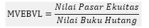 Market Value of Equity to Book Value of Total Liabilities (X4), Untuk menilai kapasitas perusahaan dalam pemenuhan kewajiban keuangannya berdasarkan nilai pasar saham, digunakan sebuah rasio khusus. Perhitungan nilai pasar ekuitas dilakukan dengan mengkalkulasikan jumlah saham yang beredar dikalikan harga pasar per lembar sahamnya. Adapun nilai buku utang merupakan hasil penjumlahan dari kewajiban lancar dan kewajiban jangka panjang. Terdapat rumus spesifik untuk menghitung rasio ini :