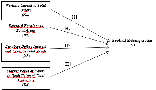 Penelitian menggunakan empat variabel independen berupa rasio keuangan yang terdiri dari Working Capital to Total Asset, Retained Earnings to Total Asset, Earnings Before Interest and Tax to Total Asset, dan Market Value of Equity to Book Value of Total Liabilities yang merupakan variabel independen. Sedangkan untuk variabel dependennya adalah prediksi kebangkrutan.