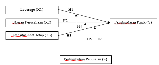 Penelitian ini merupakan replikasi penelitian terdahulu, yang dimana terdapat beberapa perbedaan, variabel bebas, sektor perusahaan dan tahun penelitian [15]. Dengan demikian, terdapat variabel yang berpotensi memperkuat atau memperlemah hubungan variabel dependen dan independen, yaitu variabel pertumbuhan penjualan. Dalam hal ini variabel pertumbuhan penjualan berpotensi sebagai moderasi yang mampu memperkuat hubungan antara ukuran perusahaan, Leverage, dan intensitas aset tetap terhadap penghindaran pajak. Pertumbuhan penjualan ini sendiri merupakan peluang dari perusahaan atas perubahan tingkat penjualan dan Leverage dari tahun ke tahun [16]. Ketika pertumbuhan penjualan mengalami peningkatan maka akan semakin besar beban pajak yang harus dibayarkan. Dengan hal ini, biasanya perusahaan melakukan penghindaran pajak dengan cara penambahan intensitas aset tetap, yang dimana hal itu akan meningkatkan tingkat beban penyusutan yang nantinya akan mengurangi laba [17].