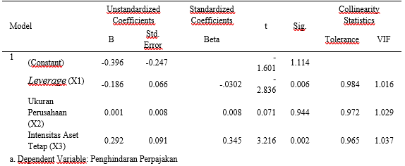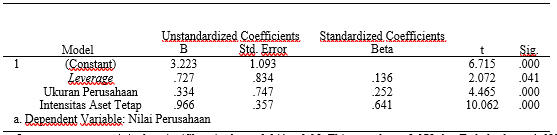 Nilai a sebesar 3.233 merupakan konstanta atau keadaan saat variabel Penghindaran pajak (Y) belum dipengaruhioleh variabel Leverage, Ukuran Perusahaan dan Intensitas Aset Tetap.