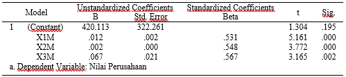 R square yang tercantum dalam tabel diatas memiliki nilai sebesar 0,760 menunjukkan bahwa kontribusi dari variabel X1, X2, dan X3 terhadap variabel Y adalah sebesar 76,0%, sementara 24,0% sisanya merupakan kontribusi dari variabel lain yang tidak dimasukkan dalam penelitian.