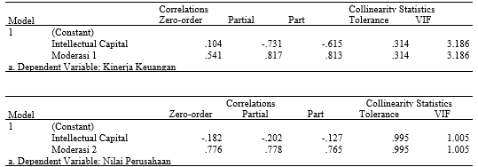 Uji Multikolonieritas bertujuan untuk menguji apakah model regresi ditemukan adanya kolerasi antar variabel bebas. Model regresi yang baik seharusnya tidak terjadi kolerasi diantara variabel bebas. Salah satu metode yang digunakan dalam program SPSS untuk mengetahui adanya multikolinieritas adalah dengan cara mengamati nilai Variance Inflation Factor (VIF) dan Tolerance. Kriterianya adalah Tolerance 0.10 atau sama dengan nilai VIF 10. Model regresi yang bebas multikolinearitas adalah yang mempunyai nilai tolerance di atas 0,1 atau VIF di bawah 10. Apabila tolerance variance di bawah 0,1 atau VIF di atas 10, maka terjadi multikolinieritas [22].