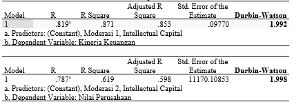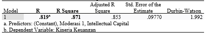 Dari tabel 9 dapat diketahui bahwa nilai R sebesar 0,819 Hal ini berarti Intellectual Capital mempengaruh kinerja keuangan secara kuat karena nilai R mendekati angka 1. Sedangkan untuk R2 yaitu sebesar 0,871 artinya 87,1% variabel Intellectual Capital mempengaruhi kinerja keuangan. ini berarti bahwa hubungan antara Kinerja Keuangan dengan variabel independen cukup baik.