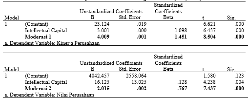 b. Hipotesis 2 diterima yaitu Intellectual Capital berpengaruh terhadap Nilai Perusahaan. Hal ini menunjukkan bahwa pengelolaan intellectual capital yang optimal akan memberikan pengaruh terhadap nilai perusahaan. Sesuai dengan Resources Based Theory bahwa perusahaan yang dapat mengelola sumber daya yang dimilikinya termasuk intellectual capital akan mampu memberikan value added dan menciptakan peningkatan nilai perusahaan.