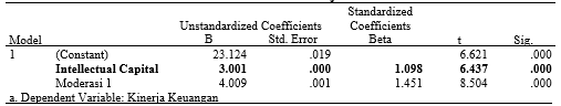 1. Konstanta (α) sebesar 23.124 menunjukan bahwa Intellectual Capital diasumsikan tetap atau sama dengan 0, maka Kinerja Keuangan adalah 23.124.