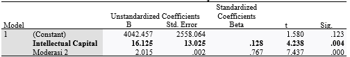 2. Koefisien Intellectual Capital sebesar 3.001 menunjukan bahwa setiap kenaikan satu satuan variable Intellectual Capital menyebabkan kenaikan Kinerja Keuangan sebesar 3.001 dengan asumsi variabel lainnya tetap sama saja dengan nol.