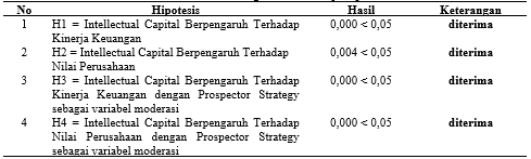 1. Hasil pengujian Pengaruh intellectual Capital Terhadap Kinerja Keuangan dengan Prospector Strategy sebagai variabel moderasi menunjukkan bahwa nilai signifikan sebesar 0.000 < 0.05 yang berarti bahwa Prospector Strategy memoderasi pengaruh intellectual Capital Terhadap Kinerja Keuangan.