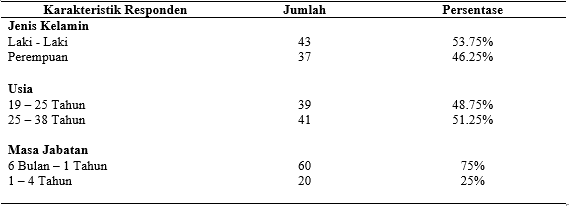 Dari hasil penelitian dengan menyebarkan kuisioner selama satu bulan mendapatkan hasil jawaban deskriptif responden yang mendapat total 80 jawaban dan data tersebut dikatakan layak untuk digunakan sebagai sumber data penelitian ini. Pada table 3 menunjukkan karyawan yang mengisi kuesioner lebih banyak karyawan laki – laki sebanyak 43 orang (53.75%) dan karyawan perempuan sebanyak 37 orang (46.25%), dengan rentang usia paling banyak umur 25 – 38 tahu (51.25%), dan masa jabatan paling lama ada direntang 6 bulan – 1 tahun kerja (75%).: