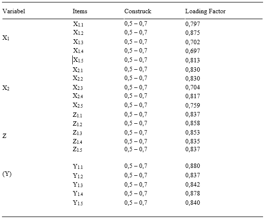 Nilai cross loading faktor untuk mengetahui apakah konstruk memiliki diskriminan yang memadai degan cara membandingkan nilai loading pada konstruk yang dituju harus lebih besar dibandingkan dengan nilai yang lain. Pada variabel X1yang dimulai dari indikator X1.1 dimana nilai cross loadingnya (font tebal pada X1.1) adalah 0,797 lebih besar dari pada cross loading-nya ke konstruk atau variabel lainnya, yaitu 0,586 ke X2, 0,498 ke Z dan 0,586 ke Y. Begitu juga dengan semua indikator lainnya dimana nilai cross loading > cross loading ke konstruk lainnya.