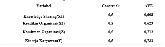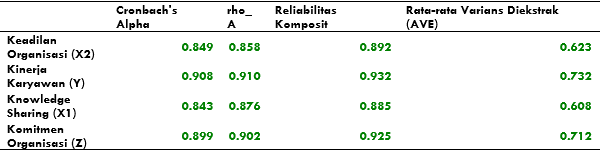 Berdasarkan tabel diatas dapat dilihat nilai AVE pada variabel X1 memperoleh nilai 0,608, AVE pada variabel X2 memperoleh nilai 0,623, AVE pada variabel Z memperoleh nilai 0,712 dan AVE pada variabel Y memperoleh nilai 0,732. Dengan Syarat: Variabel dianggap reliable jika memiliki nilai AVE diatas 0,5.