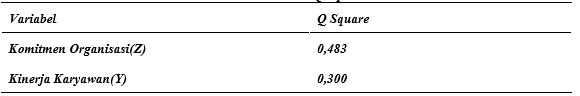 Berdasarkan tabel diatas menunjukkan nilai Q-Square pada Z = 0,483 yang artinya model kepuasan kerja dalam kategori sedang sehingga layak menjadi nilai dasar yang sesuai pada penelitian dan Q-Square pada Y= 0,300 yang artinya model kinerja karyawan dalam kategori besar sehingga layak menjadi nilai dasar yang sesuai pada penelitian. Dengan nilai Syarat apabila nilai Q square yang didapatkan 0,02 (kecil), 0,15 (sedang) dan 0,35 (besar).