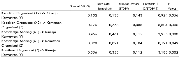 Dari hasil analisis smartPLS, ditemukan bahwa konstruk knowledge sharing memiliki pengaruh positif yang signifikan terhadap variabel kinerja karyawan. Sebab, Nilai t-statistiknya lebih besar dari nilai sebenarnya, dan. Konstruk eksogen knowledge sharing memiliki pengaruh negatif yang signifikan dengan konstruk komitmen organisasi. Nilai t-statistik pada hubungan konstruk ini lebih kecil dari nilai valuenya. Konstruk komitmen organisasi memiliki pengaruh negatif yang signifikan terhadap konstruk kinerja karyawan. Hal ini didasarkan pada nilai statistik yang lebih besar dari nilai valuenya. Sehingga dapat disimpulkan bahwa knowledge sharing memang berpengaruh pada kinerja karyawan akan tetapi komitmen organisasi belum bisa menjadi mediasi diantara variabel knowledge dan kinerja