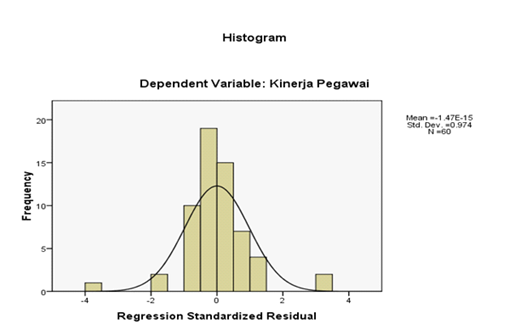 Dari hasil pengujian normalitas di atas dengan menggunakan grafik histogram, bisa dilihat bahwa kurva berbentuk lonceng, jadi bisa disimpulkan bahwa data tersebut terdistribusi normal. Dengan demikian bisa di simpulkan bahwa model regresi pengaruh variabel bebas terhadap variabel terikat telah memenuhi persyaratan normalitas data.