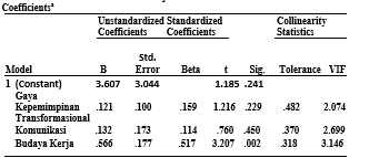 Hasil dari nilai variance inflation factor (VIF) variabel gaya kepemimpinan transformasional memiliki nilai 2,074 < 10, untuk variabel komunikasi 2,699 < 10, dan untuk variabel budaya kerja memiliki nilai 3,146 < 10. Maka, bisa di simpulkan bahwa semua variabel memiliki nilai yang lebih kecil dari angka 10. Dengan demikian, bisa di simpulkan bahwa untuk penelitian ini tidak terjadi adanya multikolinieritas dalam model regresi.