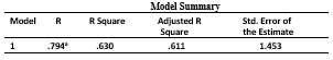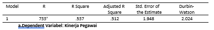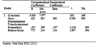 Berdasarkan hasil yang tertera pada tabel di atas, nilai Adjusted R Square (R2) tercatat 0,630. Hal ini menunjukan bahwa fluktuasi dari variabel terkait, yaitu Kinerja Pegawai (Y) dipengaruhi oleh variabel bebas yang terdiri dari Gaya Kepemimpinan Transformasional (X1), Komunikasi (X2), dan Budaya Kerja (X3).