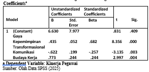Dengan demikian, bisa disimpulkan bahwa variabel Gaya Kepemimpinan Transformasional (X1) dan Budaya Kerja (X3) tidak memiliki hubungan linier terhadap Kinerja Pegawai (Y), begitu juga dengan variabel Komunikasi (X2) tidak juga menunjukan hubungan yang linier terhadap Kinerja Pegawai (Y).
