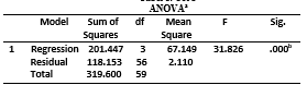 Hasil pengujian secara simultan menunjukan nilai f-hitung sebesar 31,826. sementara itu, f-tabel 5% dengan derajat kebebasan k=3 dan df=n-k-1 (dimana n=60, sehingga df=56) menghasilkan nilai f-tabel sebesar 2,769. Dengan demikian, nilai f-hitung 21,647 lebih besar dari f-tabel 2,769. Selain itu, tabel juga menunjukan nilai signifikansi (sig) sebesar 0,000, yang lebih kecil dari 0,05. Berdasarkan hasil ini, dapat dinyatakan bahwa H0 ditolak Ha diterima, yang berarti variabel bebas memiliki pengaruh signifikan secara simultan terhadap variabel terkait. Oleh karena itu, bisa disimpulkan bahwa Gaya Kepemimpinan Transformasional (X1), Komunikasi (X2), dan Budaya Kerja (X3) berpengaruh secara simultan terhadap Kinerja Pegawai (Y) Badan Perencanaan Pembangunan Daerah (BAPPEDA) Sidoarjo.