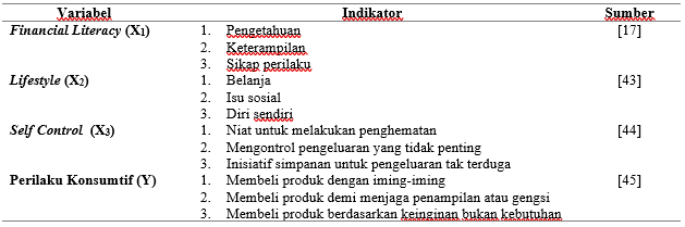Dalam penelitian [29] variabel yang digunakan yakni literasi keuangan dan pengendalian diri. Oleh karena itu, terdapat peluang untuk pengembangan lebih lanjut dalam penelitian ini dengan menambahkan variabel gaya hidup, yang diadaptasi dari penelitian [30], karena faktor tersebut merupakan elemen penting yang perlu diperhitungkan dalam perilaku konsumtif. Selain itu, pada penelitian [31] menggunakan teknik random sampling, sedangkan penelitian ini, pengambilan sampel menggunakan simple random sampling. Sementara itu, penelitian [32] meneliti generasi milenial di Kota Subang, sedangkan penelitian ini berfokus pada mahasiswa yang mengambil konsentrasi studi akuntansi di Kabupaten Sidoarjo. Perbedaan objek dan lokasi ini membuka peluang penelitian lebih lanjut, khususnya dalam memahami mahasiswa yang menempuh pendidikan di bidang akuntansi.