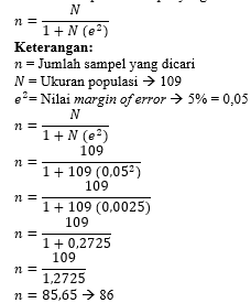 Perhitungan rumus Slovin mulanya menghasilkan 85,65 responden, kemudian dibulatkan menjadi 86 responden. Sehingga jumlah responden dalam penelitian ini adalah 86 responden.
