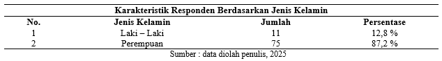 Tabel 4.1 menyajikan karakteristik responden penelitian berdasarkan jenis kelamin dan status penggunaan Shopee. Mayoritas responden dalam penelitian ini adalah perempuan, dengan jumlah mencapai 75 orang atau setara dengan 87,2% dari total keseluruhan. Data ini menunjukkan adanya dominasi partisipasi perempuan dalam studi ini. Lebih lanjut, tabel juga menginformasikan bahwa seluruh responden yang berjumlah 86 orang merupakan pengguna Shopee, baik sebagai pengguna aktif saat ini maupun yang pernah menggunakannya di masa lalu. Kecenderungan perempuan yang tinggi terhadap diskon dan promo cashback yang menarik diduga menjadi salah satu faktor dominasi ini [48].