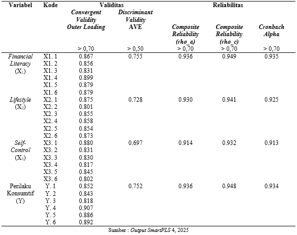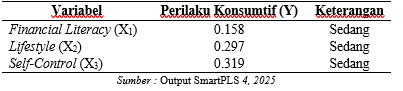 Berdasarkan Tabel 4.4, variabel Financial Literacy memiliki nilai f² sebesar 0,158 , yang menunjukkan bahwa variabel ini memberikan pengaruh sedang terhadap perilaku konsumtif. Sementara itu, nilai f² pada variabel Lifestyle tercatat sebesar 0,297, yang mengindikasikan bahwa variabel tersebut berpengaruh sedang terhadap perilaku konsumtif. Variabel Self-Control memiliki nilai f² sebesar 0,319 yang menandakan adanya pengaruh sedang terhadap perilaku konsumtif. Ketiga variabel tersebut memberikan kontribusi yang berbeda dalam memengaruhi tingkat konsumsi seseorang. Oleh karena itu, evaluasi nilai f² diperlukan untuk mengetahui seberapa besar peran masing-masing variabel dalam menjelaskan perilaku konsumtif individu.