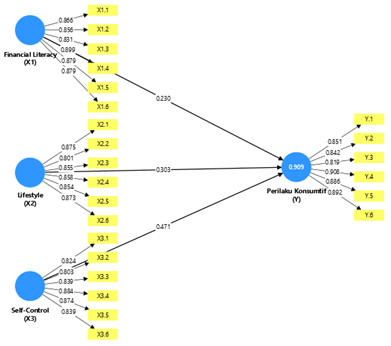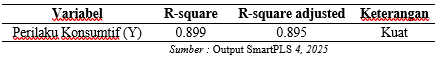 Merujuk pada Tabel 4.3, nilai R-Square variabel perilaku konsumtif adalah sebesar 0,899. Nilai ini menandakan bahwa proporsi sebesar 89% perubahan pada perilaku konsumtif dapat diterangkan oleh variabel-variabel financial literacy, lifestyle, dan self-control yang dianalisis dalam studi ini. Selebihnya, variasi dalam perilaku konsumtif dipengaruhi oleh faktor-faktor lain di luar cakupan penelitian ini. Implikasinya adalah bahwa meskipun variabel literasi keuangan, gaya hidup, dan kontrol diri memiliki dampak yang signifikan, perilaku konsumtif responden juga dipengaruhi oleh faktor-faktor di luar model penelitian ini. Dengan kata lain, ketiga variabel tersebut bukanlah satu-satunya penentu perilaku konsumtif.