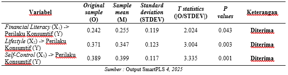 Berdasarkan tabel 4.6 hasil pengujian t, teridentifikasi beberapa pengaruh signifikan dari variabel-variabel independen terhadap perilaku konsumtif. Pertama, literasi keuangan memberikan dampak positif signifikan pada perilaku konsumtif, dengan koefisien jalur 0,242 dan nilai P sebesar 0,043. Kedua, gaya hidup menunjukkan pengaruh positif signifikan terhadap perilaku konsumtif, yang dibuktikan dengan koefisien jalur 0,371 dan nilai P 0,003. Ketiga, kontrol diri juga terbukti memiliki pengaruh positif signifikan pada perilaku konsumtif, ditandai dengan koefisien jalur 0,389 dan nilai P 0,001.