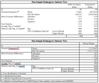 Hasil analisis deskriptif diatas menunjukkan variabel Harga Saham memiliki nilai terkecil(minimum)sebesar 1.03. Nilai terbesar (maksimum) sebesar 6425.00. Rata-rata Harga Saham menunjukkan hasil yang positif sebesar 1135.9642. artinya secara umum Harga Saham yang diterima positif (mengalami kenaikan). Nilai standar deviasi Harga Saham adalah sebesar 12.17162 (diatas rata-rata) artinya Harga Saham memiliki tingkat variasi data yang tinggi.