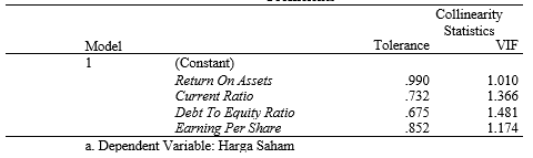 Uji multikolinearitas dimaksudkan jika dalam penelitian dengan model regresi yang dilakukan terjadi korelasi antar variabel bebas (independen). Dalam penelitian tidak terjadi korelasi di antara variabel independen merupakan model regresi yang baik. Karena jika variabel independen saling berkorelasi, maka variabel tersebut tidak ortogonal. Variabel independen yang nilai korelasi antar sesama variabel independen sama dengan nol disebut dengan varaibel orthogonal [31]. Metode yang digunakan untuk menguji adanya multikoliniearitas ini dapat dilihat dari nilai tolerance atau variance inflantion factor (VIF). Batas yang ditentukan untuk menunjukkan adanya multikolinearitas atau tidak dari nilai tolerance < 0,10 atau sama dengan nilai VIF > 10.