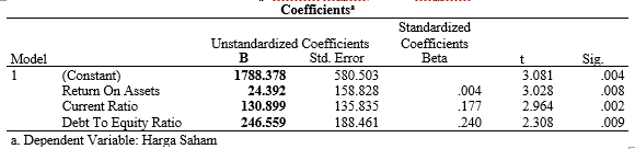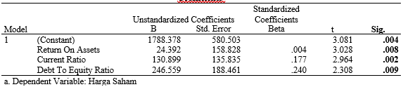 Dalam rangka menguji Pengaruh Return On Assets, Current Ratio Dan Debt To Equity Ratio terhadap Harga Saham, maka digunakan analisis regresi berganda. Perhitungan dilaksanakan dengan program SPSS versi 27 dan diperoleh hasil sebagai berikut: