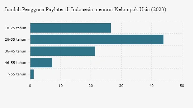 Shopee adalah sebuah platform e-commerce yang memungkinkan penguna untuk melakukan transkasi jual beli secara online. Platfrom ini berfokus pada penggunaan melalui perangkat mobile, sehingga memberikan kemudahan dan kenyamanan bagi konsumen dalam mencari serta membeli berbagai kebutuhan sehari-hari kapan saja dan dimana saja [6]. Metode pembayaran yang ditawarkan shopee juga beragam, seperti shopeepay, seabank, shopee paylater, transfer bank, dan pembayaran ditempat (cash on delivery/cod). Salah satu fitur yang menarik dari metode pembayaran shopee adalah tersedianya opsi shopee paylater. shopee paylater menjadi salah satu fitur yang menarik perhatian karena memberikan keleluasan bagi pengguna dalam mengatur waktu pembayaran. Fitur shopee paylater adalah metode pembayaran kredit digital yang tersedia pada platform shopee, dimana perusahaan tersebut menyediakan pinjaman terhadap pengguna untuk membeli barang yang mereka inginkan [7]. Dengan hadirnya fitur ini, konsumen dapat melakukan pembelian produk terlebih dahulu dan membayarnya dikemudian hari, baik secara penuh dibulan berikutnya atau melalui cicilan bulanan. Melalui kemudahan ini, konsumen tetap dapat memenuhi kebutuhan konsumsi meskipun belum memiliki dana secara langsung saat melakukan transaksi. Sistem pembayaran ini memiliki mekanisme yang hampir serupa dengan kartu kredit dimana pengguna akan dikenakan bunga serta memiliki batas kredit dengan ketentuan tanggal jatuh tempo. Namun, perbedaan utama terletak pada proses pendaftaranya yang lebih mudah dan cepat tanpa perlu melalui prosedur verifikasi yang rumit [8]. Dengan demikian, fitur ini menjadi solusi yang mudah diakses oleh masyarakat, terutama generasi muda yang menginginkan kenyamanan dalam bertransaksi namun belum memiliki akses terhadap layanan kredit digital formal. Terdapat beberapa kasus yang viral dibicarakan disosial media saat ini mengenai penggunaan layanan fitur shopee paylater. Data menunjukkan bahwa total hutang pengguna shopee paylater meraih Rp 6,81 triliun per Mei 2024. Agusman sebagai anggota Dewan Komisioner Otoritas Jasa Keuangan menyampaikan bahwa total piutang pembiayaan melalui layanan shopee paylater mengalami peningkatan yang tinggi sebesar 33,64%. dibandingkan dengan tahun sebelumnya [9]. Berdasarkan hasil survei Kata data Insight Center (KIC) yang bekerja sama dengan Otoritas Jasa Keuangan (OJK), generasi millenial tercatat sebagai pengguna layanan shopee paylater terbanyak di Indonesia. Berikut ini merupakan gambaran yang menujukkan perbandingan tingkat penggunaan shopee paylater berdasarkan kelompok usia.