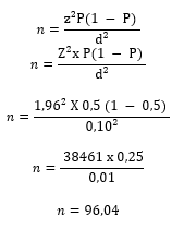 Berdasarkan rumus diatas, tingkat alpha yang digunakan dalam penelitian ini adalah 95% atau 1,96. Total populasi yang belum diketahui adalah sebagai berikut :