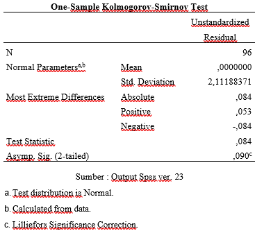 Berdasarkan hasil uji normalitas yang telah dilakukan dengan menggunkan One-sample Kolmogorov- Sminov Test yang disajikan pada tabel 3. Diatas menujukkan bahwa nilai signifikansi sebesar 0,090. Berdasarkan ketentuan yang telah ditetapkan, data dikatakan berdistribusi normal apabila uji normalitas memiliki nilai signifikansi < 0,005 (lebih besar dari 0,005) Dengan demikian, dapat disimpulkan bahwa semua data dalam penelitian ini berdistribusi normal dan memenuhi asumsi normalitas.