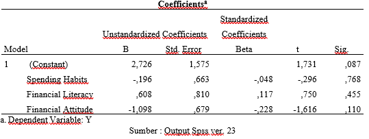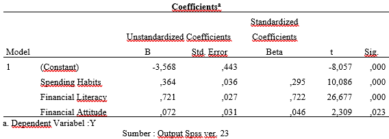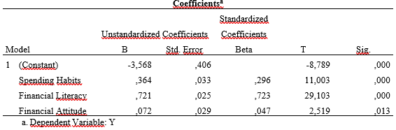 Berdasarkan hasil analisis regresi berganda yang ditampilkan dalam tabel 5, diperoleh persamaan regresi Y= - 3,568+ 0,364 (X1) + 0, 721 (X2) + 0, 072 (X3). Nilai konstanta bernilai negatif, yaitu -3,568 artinya spending habits, financial literacy dan financial attitude bernilai 0 maka keputusan pembelian menggunakan fitur shopee paylater akan cenderung mengalami penurunan sebesar -3,568. Nilai koefisien regresi variabel spending habits (X1) sebesar 0,364 menunjukkan bahwa setiap kenaikan satu satuan spending habits maka keputusan pembelian menggunakan fitur shopee paylater akan meningkat sebesar 0,364. Nilai koefisien regresi variabel financial literacy (X2) sebesar 0,721 menunjukkan bahwa setiap kenaikan satu satuan financial literacy maka keputusan pembelian menggunakan fitur shopee paylater akan meningkat sebesar 0,71. Nilai koefisien regresi variabel financial attitude (X3) sebesar 0,072 menunjukkan bahwa setiap kenaikan satu-satuan financial literacy maka keputusan pembelian menggunakan fitur shopee paylater akan meningkat sebesar 0,072.