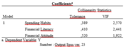 Berdasarkan hasil pengujian yang telah disajikan pada tabel 4. Diatas menunjukkan bahwa nilai signifikansi (sig) untuk variabel spending habits (X1) adalah 0,768, variabel financial literacy (X2) adalah 0.455 dan variabel financial attitude (X3) adalah 0,110. Dikarenakan ketiga nilai signifikansi tersebut lebih besar dari 0,05 maka dapat disimpulkan bahwa data tersebut tidak terdapat gejala heteroskedastisitas.