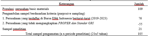 Populasi dalam penelitian ini terdiri dari 109 perusahaan yang bergerak di sektor industri bahan dasar dan kimia serta terdaftar di Bursa Efek Indonesia (BEI) selama periode 2019-2023. Sampel penelitian dipilih menggunakan teknik purposive sampling, yaitu dengan menetapkan kriteria tertentu untuk memastikan relevansi perusahaan dengan tujuan penelitian. Berdasarkan kriteria tersebut terpilih 21 perusahaan sebagai sampel penelitian. Dengan periode pengamatan selama lima tahun (2019-2023) prosedur pengambilan sampel dijelaskan lebih lanjut pada Tabel 2.